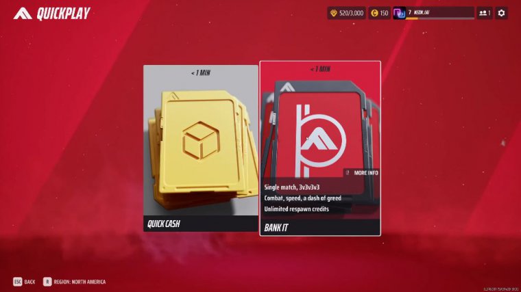 You have three characters right now; this is the medium one, and they all kind of have their own unique specializations. As well as their unique weapons, here is the heavy one. I have already unlocked a few things, but not everything is all right. Let's talk about the different game modes. You have quick play and tournaments, and in quick play, you have quick cash or cash out, which is a single match of three teams each.